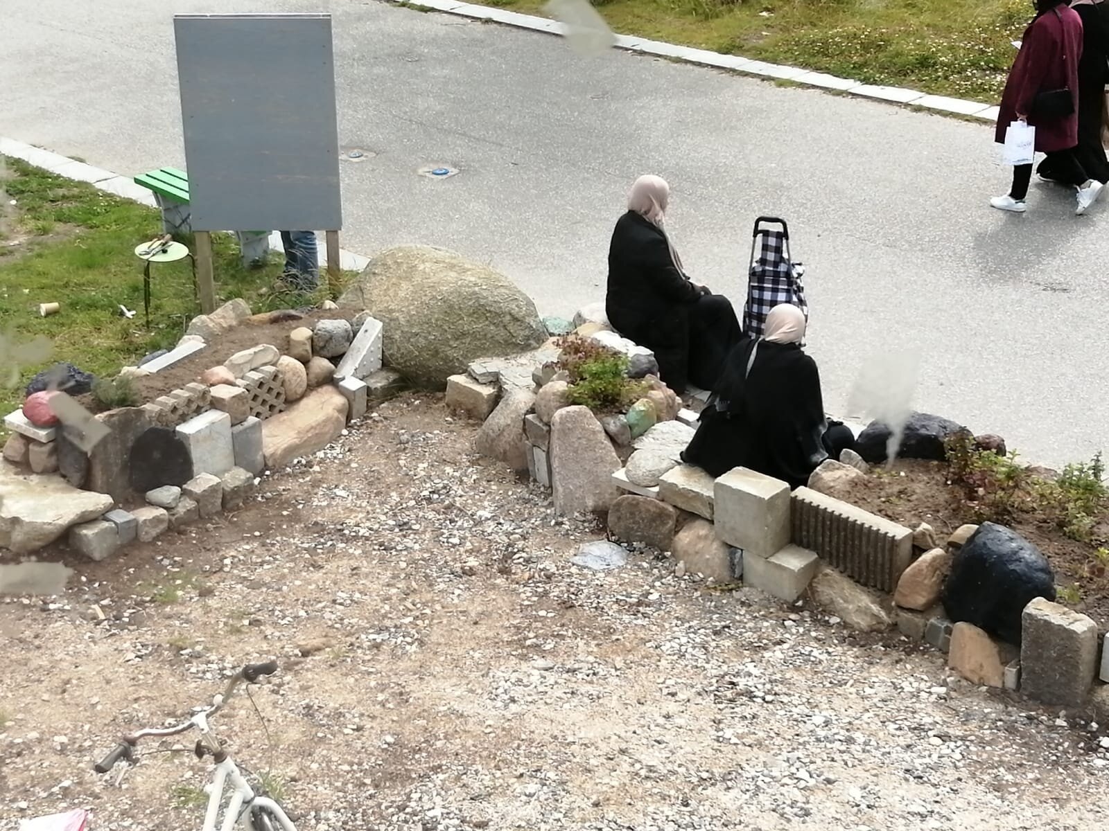 The dike is built of stone and concrete rubble from Gellerup's long rebuilding history together with "fake" concrete stones, which we ourselves have made and painted in connection with. several workshops along the way. It was a desire to give people a different relationship to concrete than just concrete in the apartment blocks, by having the building material in their hands, seeing what it really can do, and even conquering the concrete, so to speak. The tracing and collection of concrete, paving and stone remains from Gellerupparken was a large part of the process. What is actually lying right here around us? Stones and dikes are established and made of materials that in every way are the opposite of how to build and plan in Gellerup - with responsiveness to the local place, built up here and now with what is right around, locally produced and with use and the involvement of the stories, forces and people who live and use the place.